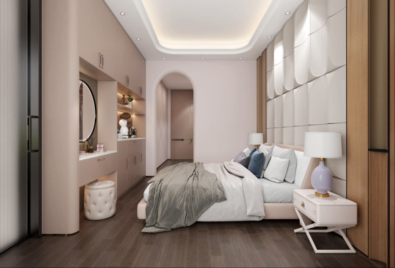 | ডিজাইন বৈশিষ্ট্য | বিছানার পায়ের কাছে ওয়ারড্রোবটি একটি ভ্যানিটি দিয়ে সজ্জিত, যেখানে খোলা তাকের নকশা রয়েছে |