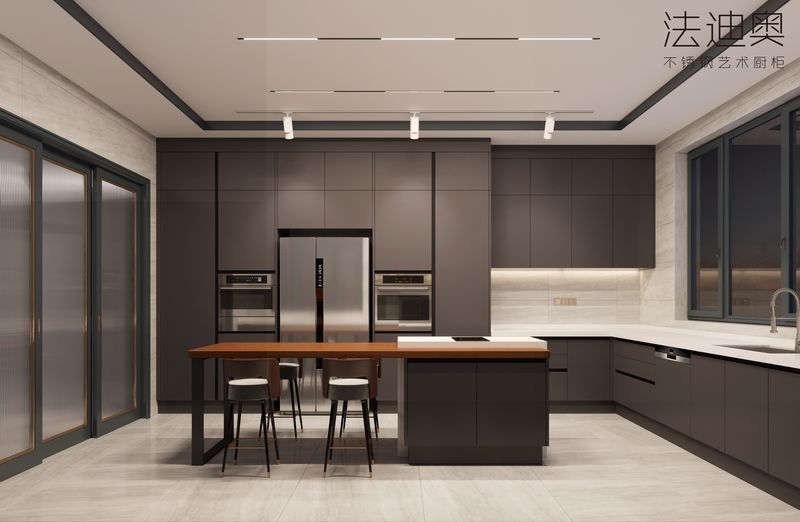 এই কাস্টম রান্নাঘরের ক্যাবিনেটটি একটি ভিন্ন সমাপ্তি কৌশলটির চারপাশে নির্মিত হয়েছেঃ কালো রঙের স্টেইনলেস স্টিলের ক্যাবিনেট কাঠামোর সাথে জুড়ে।এই সংমিশ্রণটি ক্রেতারা স্টেইনলেস স্টীল কেবিনেটরি থেকে প্রত্যাশিত পরিষ্কারযোগ্যতা এবং প্রকল্পের স্থায়িত্ব হারানো ছাড়া একটি উষ্ণ বিলাসবহুল অভিব্যক্তি দেয়.