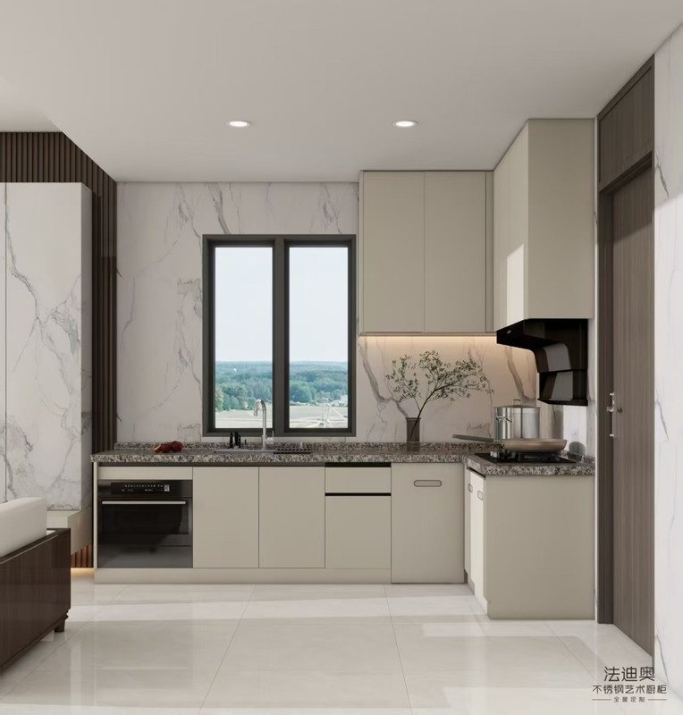The Fadior Modern Beige Stainless Steel Kitchen Cabinet is designed to combine durability, elegance, and functionality in a contemporary home. Crafted from premium stainless steel with a soft beige finish, this L-shaped layout provides a seamless balance of style and practicality. The clean lines, marble-inspired backsplash, and ample storage highlight a sophisticated yet minimal design. Unlike traditional wood cabinets, Fadior’s stainless steel structure ensures resistance to moisture, heat, and wear, making it ideal for long-lasting use. With integrated appliances and thoughtfully designed compartments, it elevates the kitchen into a refined and efficient living space.