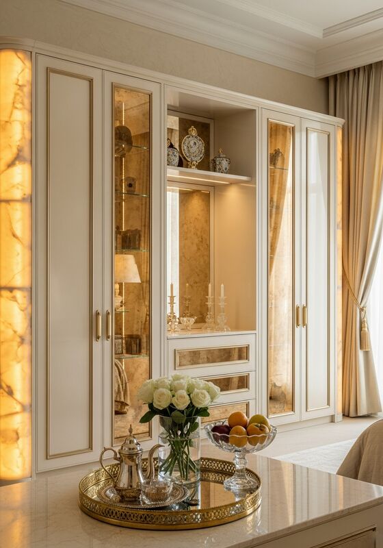 | Q: Is 304 food-grade stainless steel with PVD champagne gold coating; cream high-gloss lacquer panels; gold-tinted antique mirror glass; honey onyx amber LED modules necessary for this bedroom wardrobe? For premium projects, 304 food-grade stainless steel with PVD champagne gold coating; cream high-gloss lacquer panels; gold-tinted antique mirror glass; honey onyx amber LED modules is chosen because it holds up better against moisture, cleaning routines, and long-term dimensional movement than wood-based construction. That is especially relevant in primary bedroom walk-in wardrobe for luxury residences, hospitality suites, and boutique residential developments where buyers want a cleaner maintenance story without giving up a tailored finish direction. |