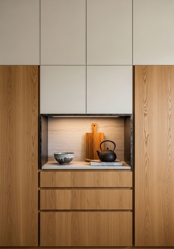 | ডিজাইন হাইলাইটসজাপান্ডি মিনিমালিজম সহ ওয়াবি-সাবি আন্ডারটোনস — পরিষ্কার রেখাগুলি উপাদানের উষ্ণতা, দৃশ্যমান গ্রেইন প্যাটার্ন এবং হাতে তৈরি ধাতব কাজের বিবরণ দ্বারা নরম করা হয়েছে, প্রাকৃতিক ওক মধু (প্রাইমারি), উষ্ণ পার্চমেন্ট সাদা (উপরের প্যানেল এবং অভ্যন্তরীণ), উষ্ণ কাদামাটি ধূসর (ঐচ্ছিক অ্যাকসেন্ট অভ্যন্তরীণ), কালো লোহা (ফ্রেম অ্যাকসেন্ট), সুশৃঙ্খল অনুপাত, এবং ৩০৪ স্টেইনলেস স্টিলের কাঠামোগত ফ্রেম সহ প্রাকৃতিক জাপানি ওক ভিনিয়ার ডোর প্যানেলগুলিতে সোজা গ্রেইন এবং তৈলাক্ত ম্যাট ফিনিশ রয়েছে। পৃষ্ঠাটি একটি সমাধান করা স্পেসিফিকেশন হিসাবে পড়া উচিত, একটি সাধারণ স্টোরেজ বক্স হিসাবে নয়। |