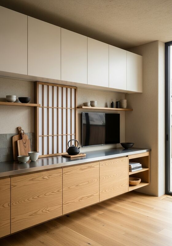 ওয়াবি-সাবি উপাদান উষ্ণতার সাথে সংযত জাপানি মিনিমালিজম — সোজা-শস্য ওক আধিপত্য, উষ্ণ অফ-হোয়াইট রিসেস |